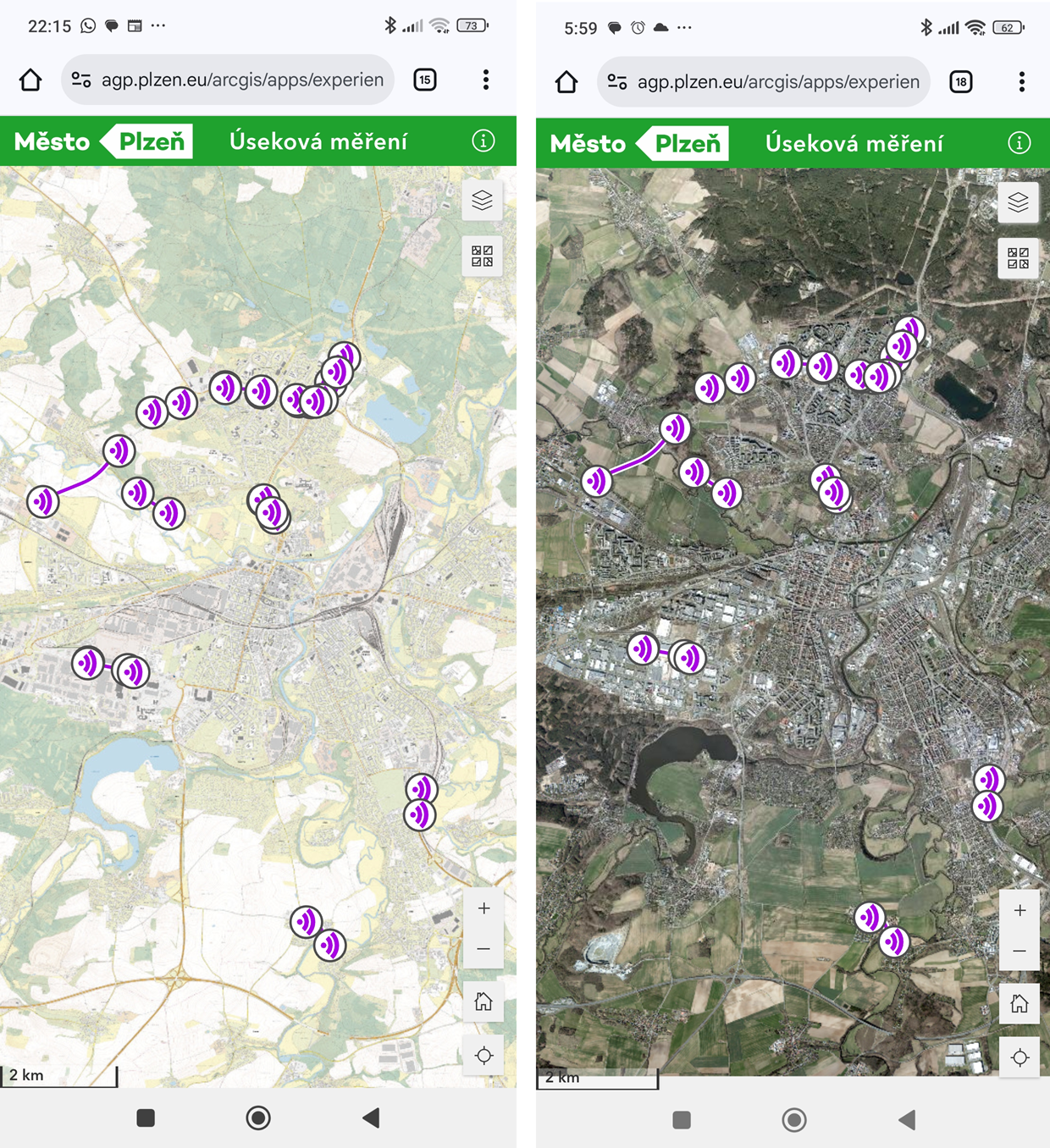 Mapa úseků komunikací, na kterých je prováděno úsekové měření rychlosti je k dispozici v mapové aplikaci Geoportálu města Plzně.