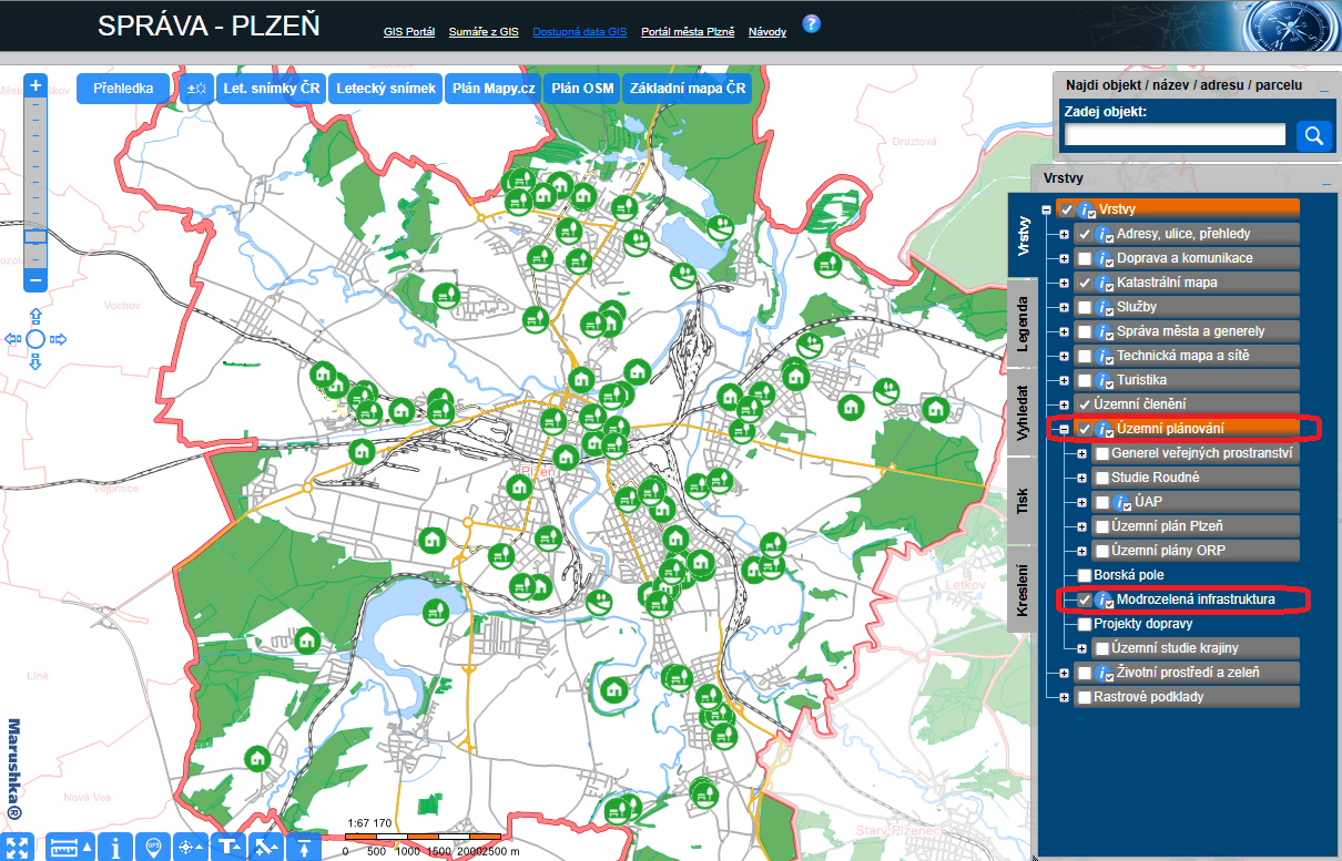 Do mapového projektu Správa byly přidány nové mapové vrstvy: Modrozelená infrastruktura, Veřejná prostranství, Povodňový plán, Oceňování věcných břemen a byla aktualizována katastrální mapa mimo ORP